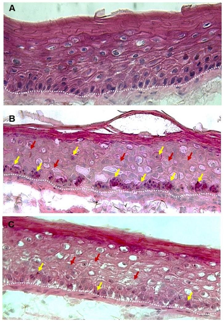 Figure 5: Exemplary representation of UVB-irradiated 3D full skin models with H&E staining after 24 hours. A) untreated control tissue, not irradiated (reference). B) untreated tissue irradiated with 200 mJ/cm² (positive control). C) tissue treated with AstaCos® OL50 after irradiation with 200 mJ/cm². Yellow arrows: sunburned cells (SBCs), red arrows: hydropic cells or tissue, dashed white line: epidermal-dermal transition zone