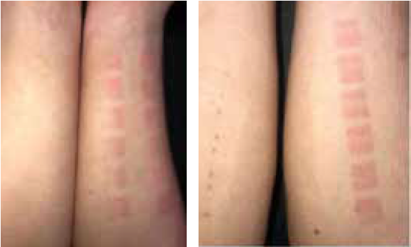 Figure 4: Photo documentation of erythema values in the exposed test areas on right and left forearms 24 hours after identical exposure to UV light on either side (right fore-arm: placebo, left forearm: topical astaxanthin): left forearm showing no erythema, right forearm showing erythema in the exposed test areas