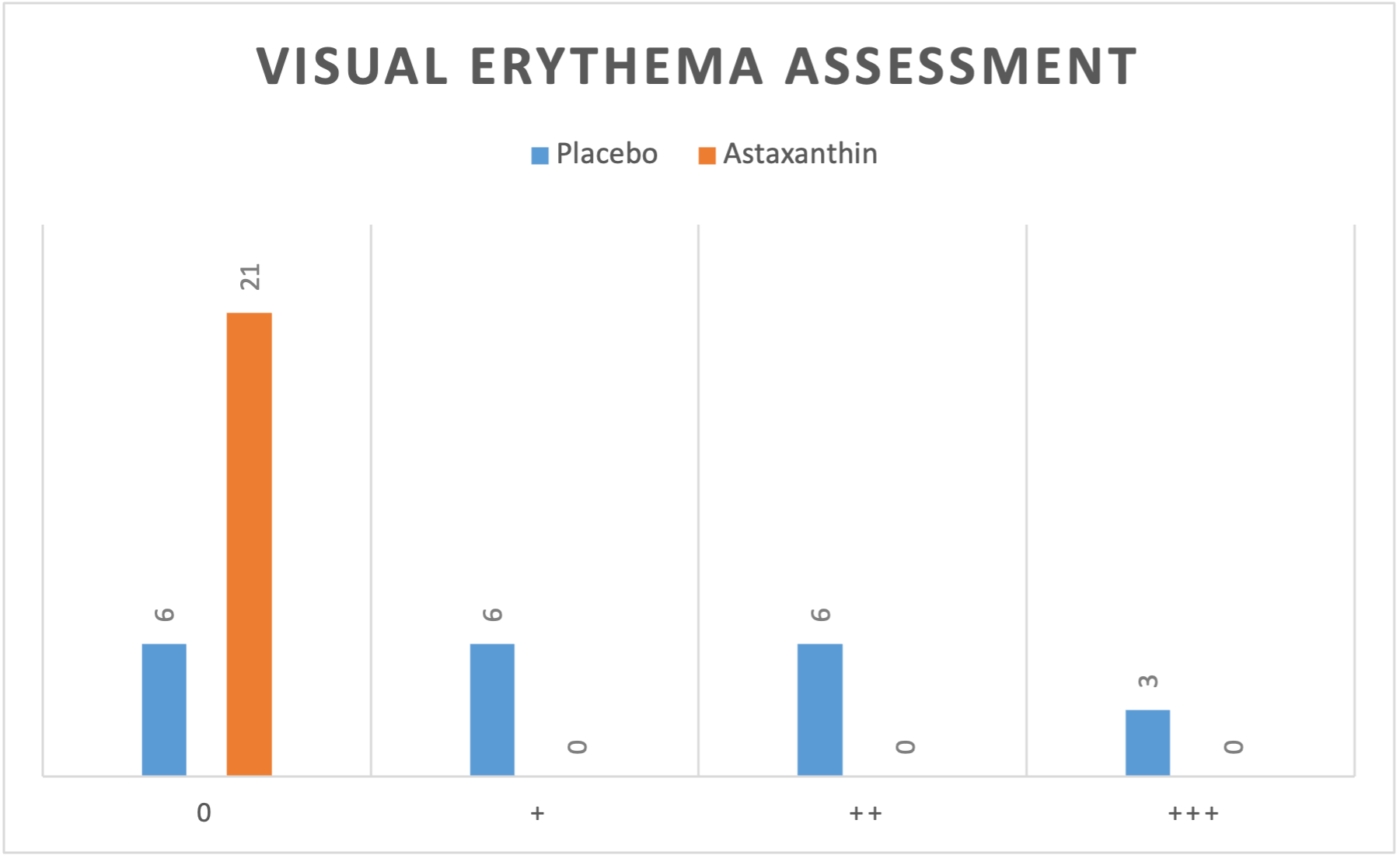 Table 1: Results of the visual assessment of erythema values in the exposed test areas 24 hours after identical exposure to UV light on either side (right forearm: placebo, left forearm: topical astaxanthin).