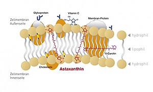 Durch seine Hydroxylgruppen und Ketogruppen besitzt das Molekül Astaxanthin außerdem die Eigenschaft sich sowohl an hydrophile als auch lipophile Verbindungen zu binden. Aus diesem Grund kann es sich an Zellmembranen von außen sowie innen knüpfen und dadurch seine positive Wirkung im gesamten Körper entfalten (3,9).