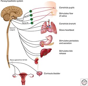 Abbildung 1: Schematische Darstellung der efferenten (motorischen) Projektionen des parasympathischen autonomen Nervensystems (ANS). Postganglionäre Axone aus ganglionären Zellen innervieren das Herz (Verlangsamung der Herzfrequenz, Verringerung der Herzkontraktilität) und weitere Organe.[12]